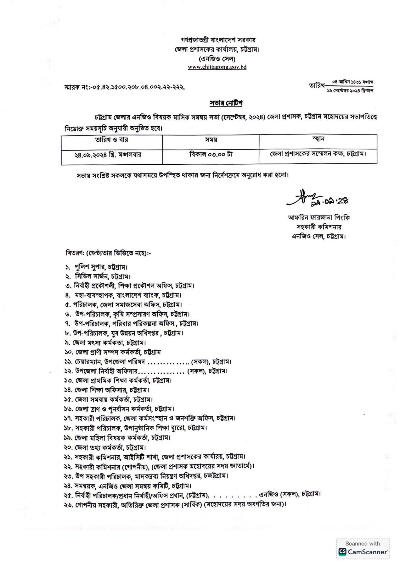 Date of meeting: 24 September 2024, Tuesday Time: Afternoon: 03.00 pm Venue: District Commissioner's Conference Room, Chittagong.